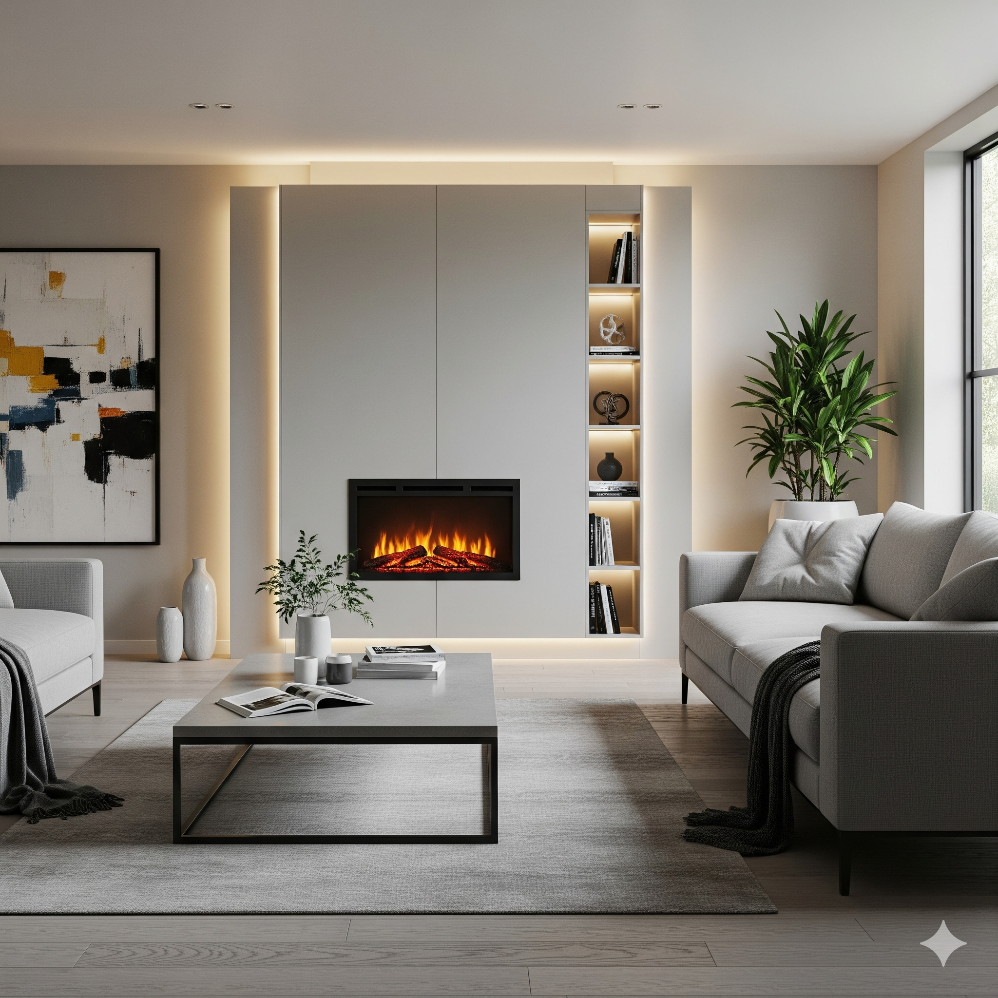 • Floating Shelves & Cabinets: Incorporate open shelving on either side of the fireplace to display decorative items, books, or art. Below the TV, you can build discreet, push-to-open cabinets to hide games consoles, soundbars, and cable boxes. This keeps your living space looking clean and minimalist.